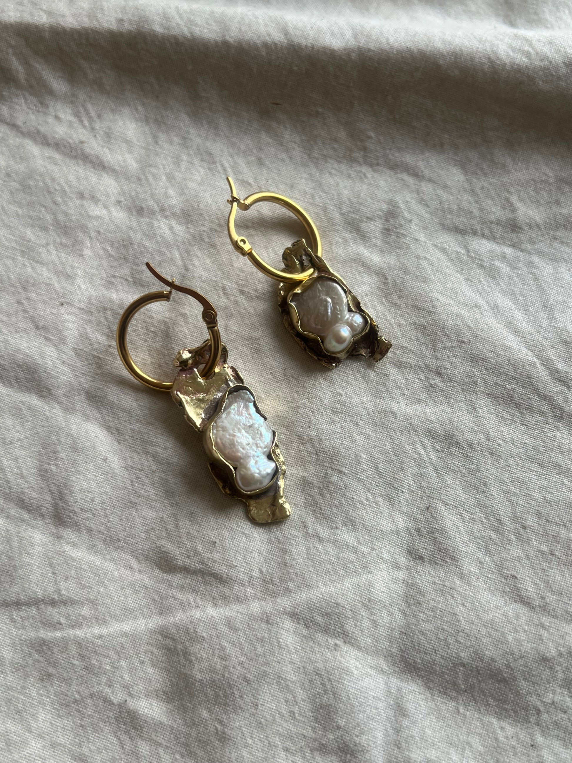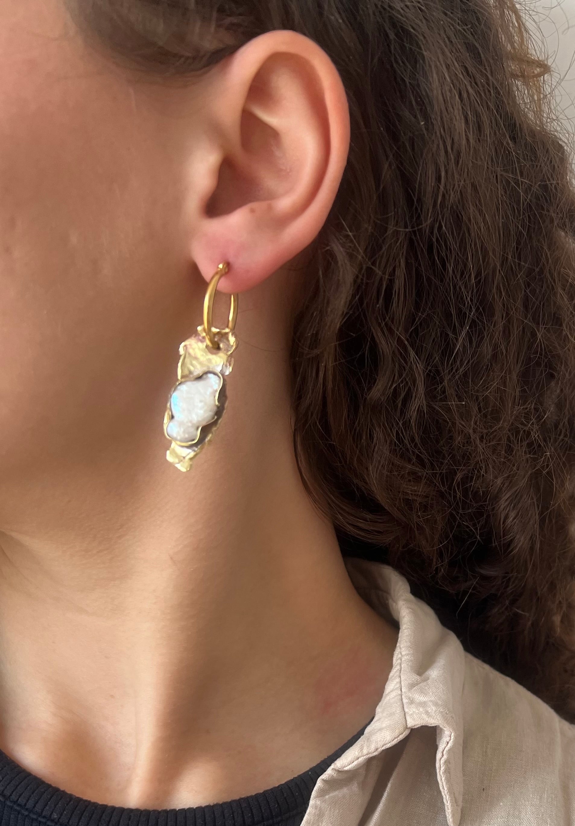 Aros de acero con dije hecho a mano en bronce reticulado con piedra engarzada. Todas las bases y piedras son únicas y diferentes entre si.