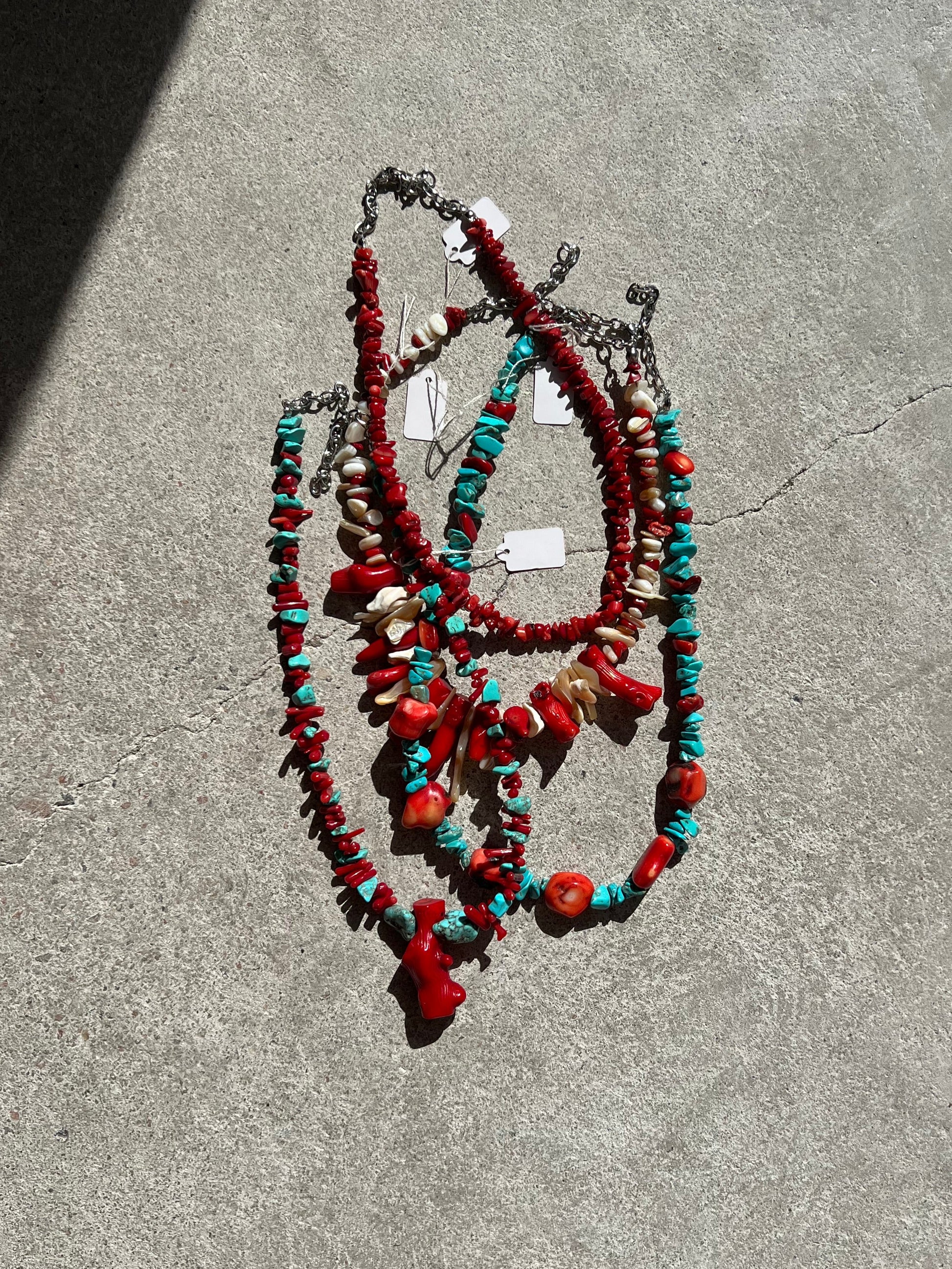 Collar hecho a mano con coral y turquesas. Mide 35 cm de largo + 10 de cadena para regular