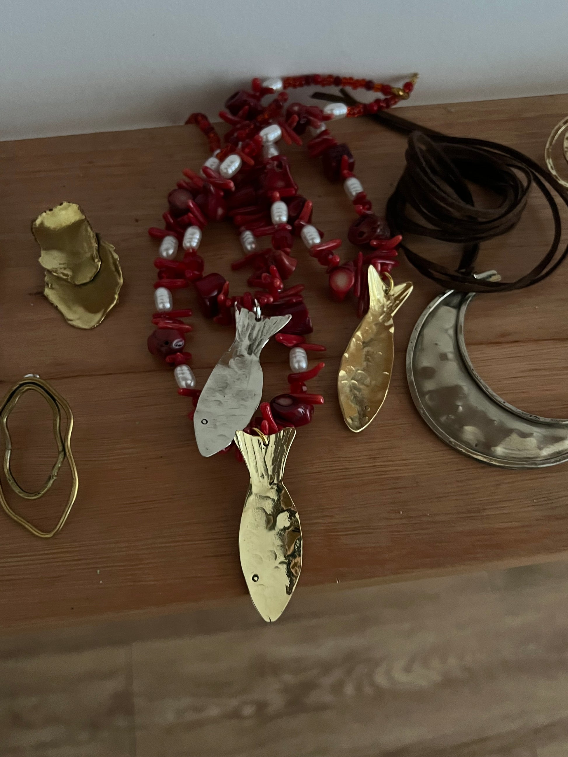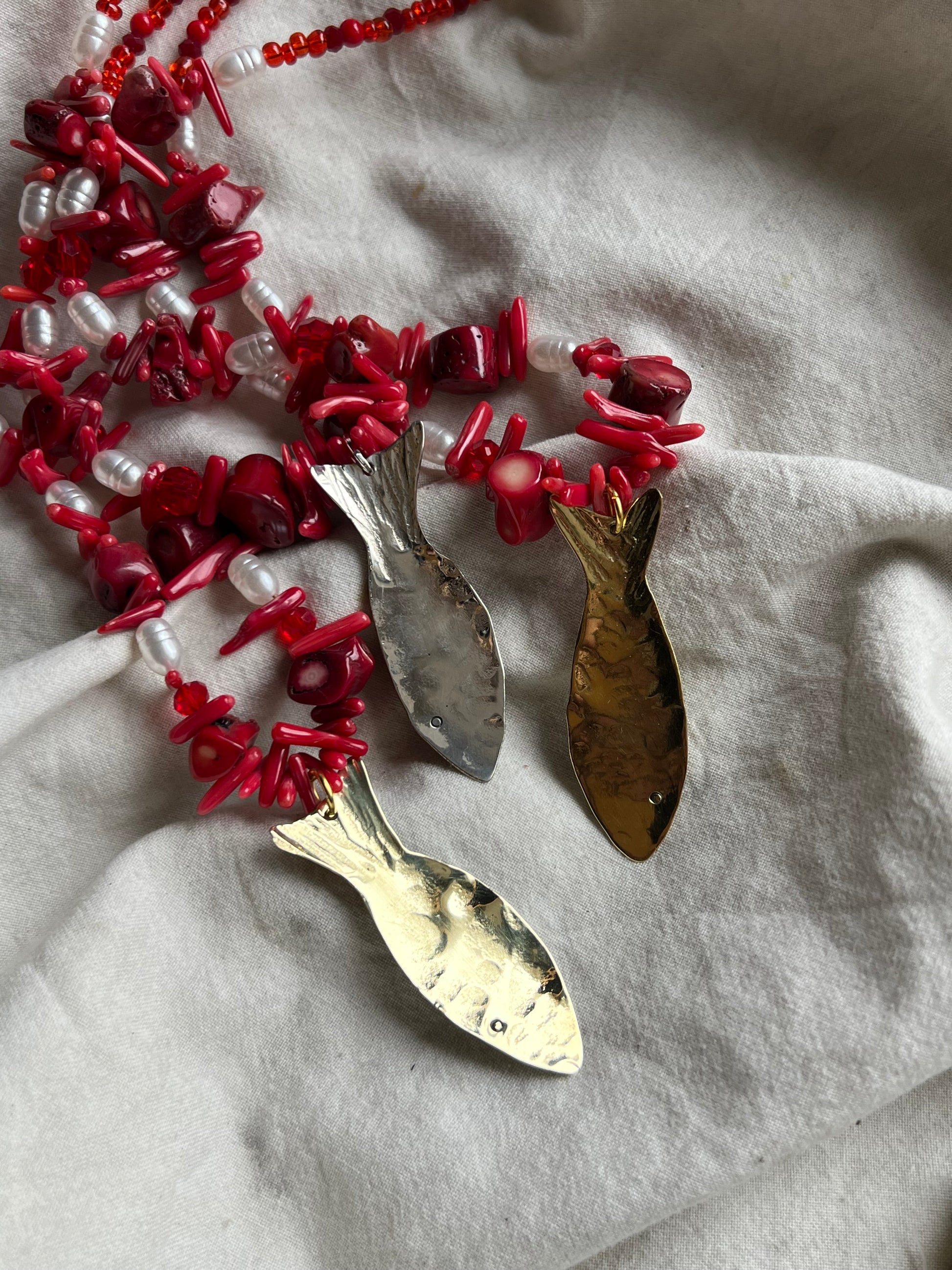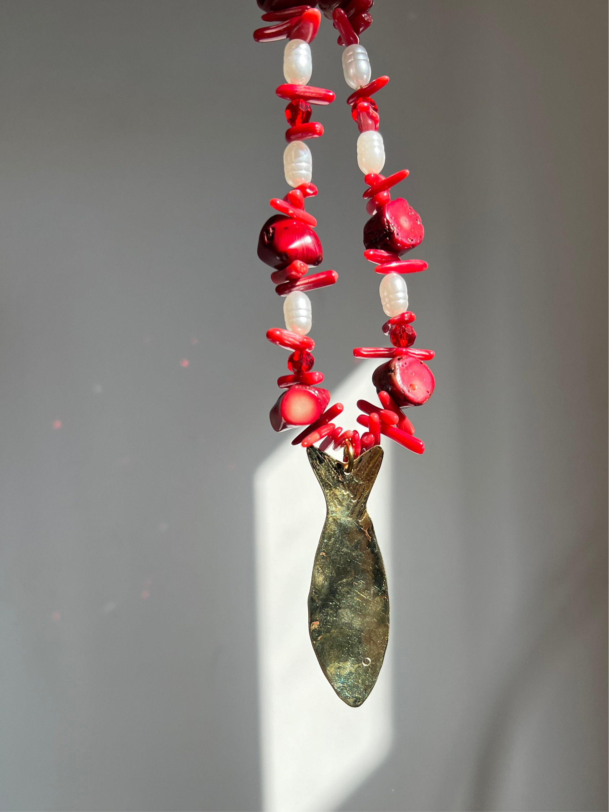 Collar con dije hecho a mano en bronce o en alpaca, con coral y distinto tipos de cuentas, todas las piezas de coral son diferentes entre sí.