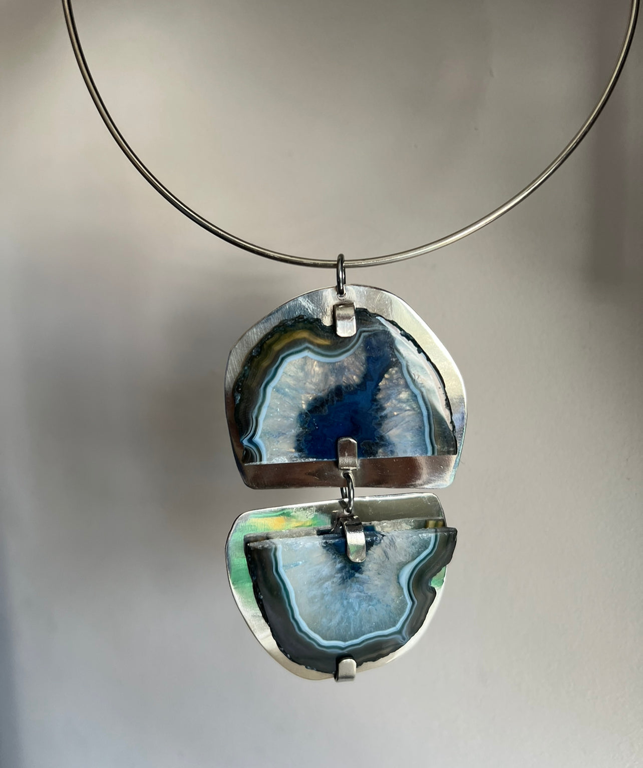 Gargantilla hecha a mano en alpaca con dije doble de ágata