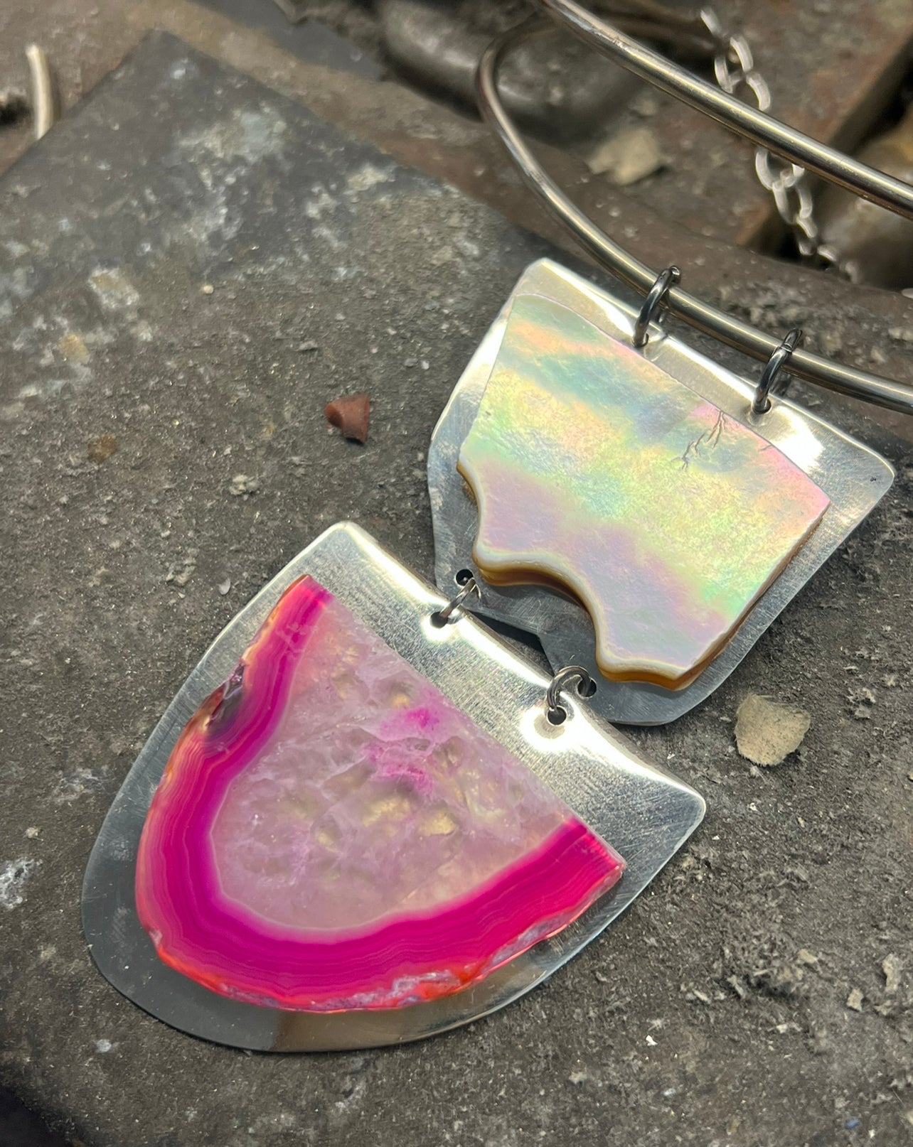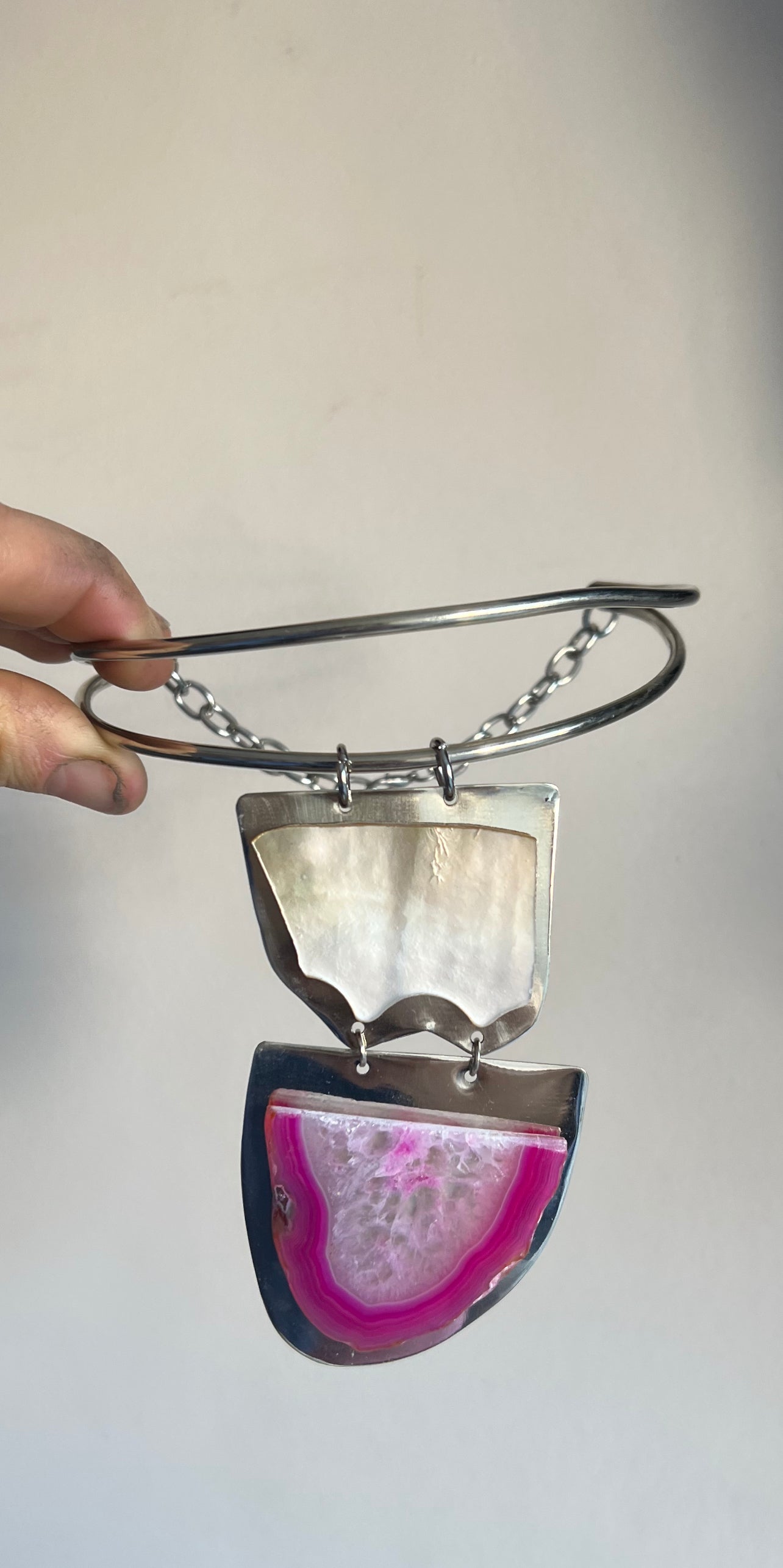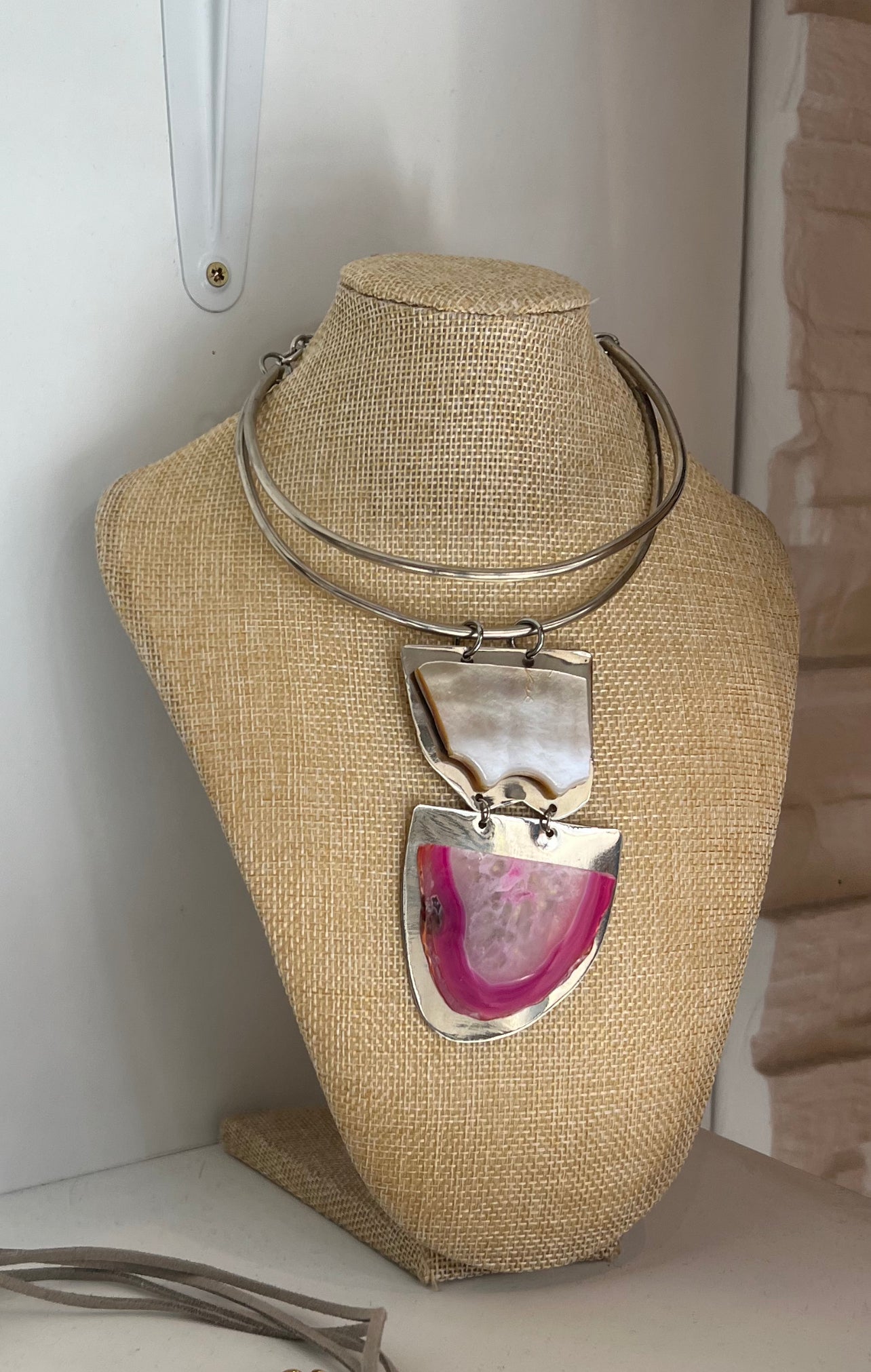 Gargantilla doble en alpaca con dije de ágata con nácar irregular.