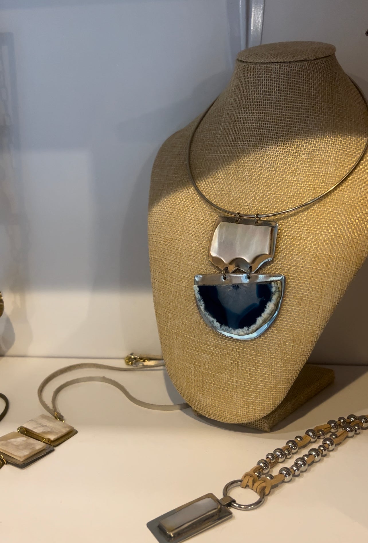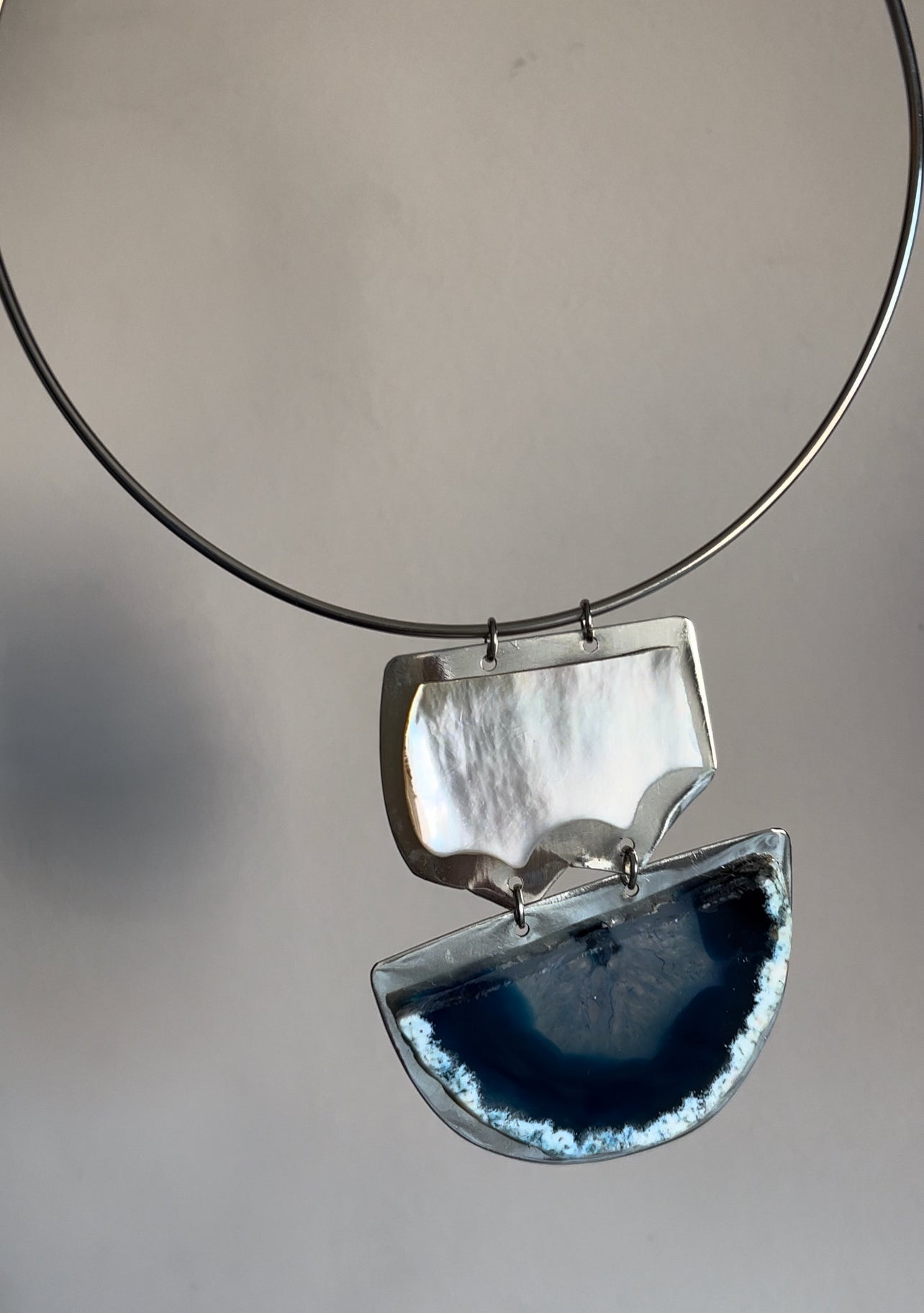 Gargantilla de 1 aro hecha en alpaca con dije de ágata y nácar irregular.