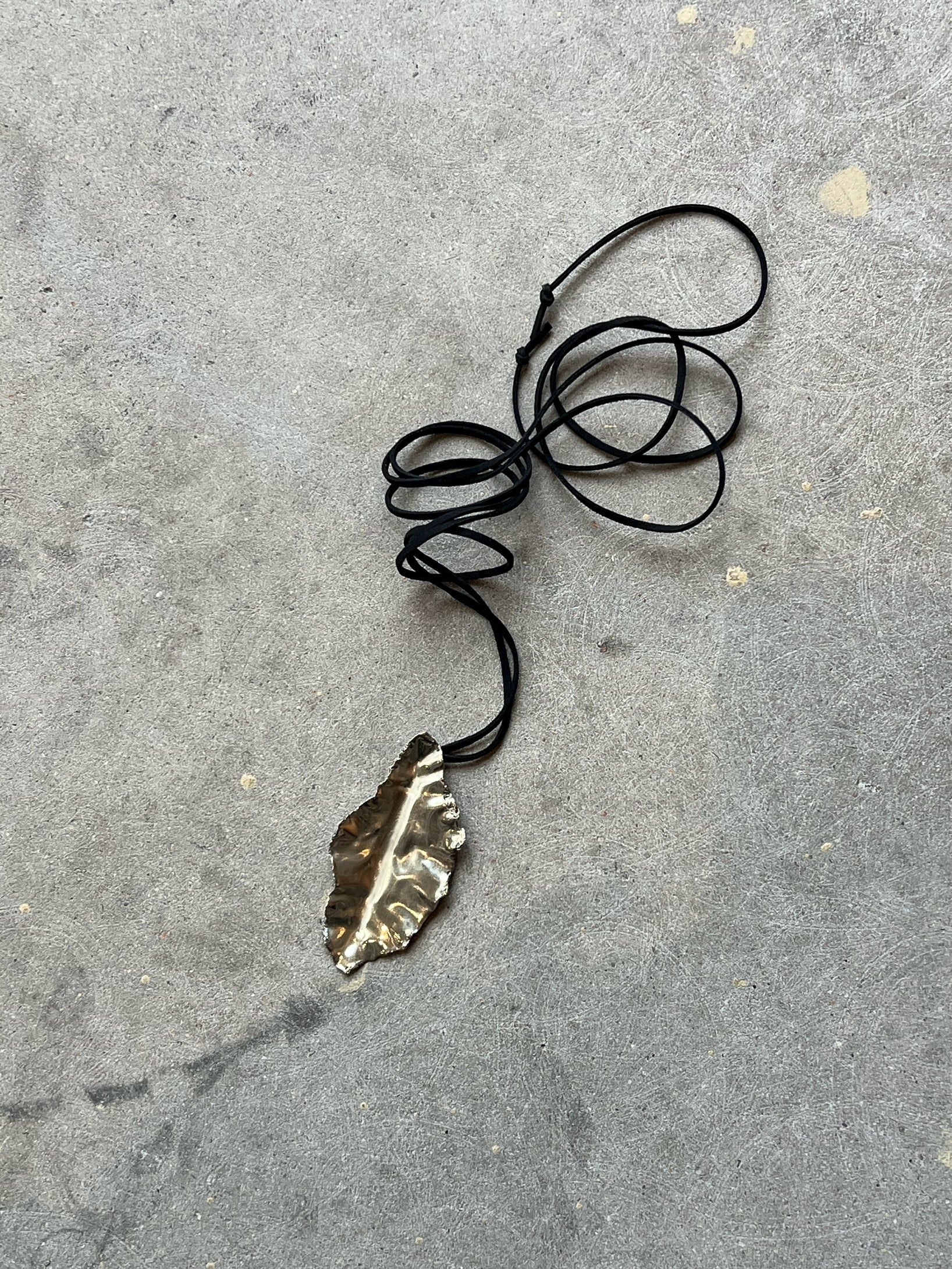 Dije hecho a mano en alpaca también se puede hacer en bronce, todas las hojitas son similares pero diferentes entre si, viene con tiento de gamuza larguito para darle varias vueltas.