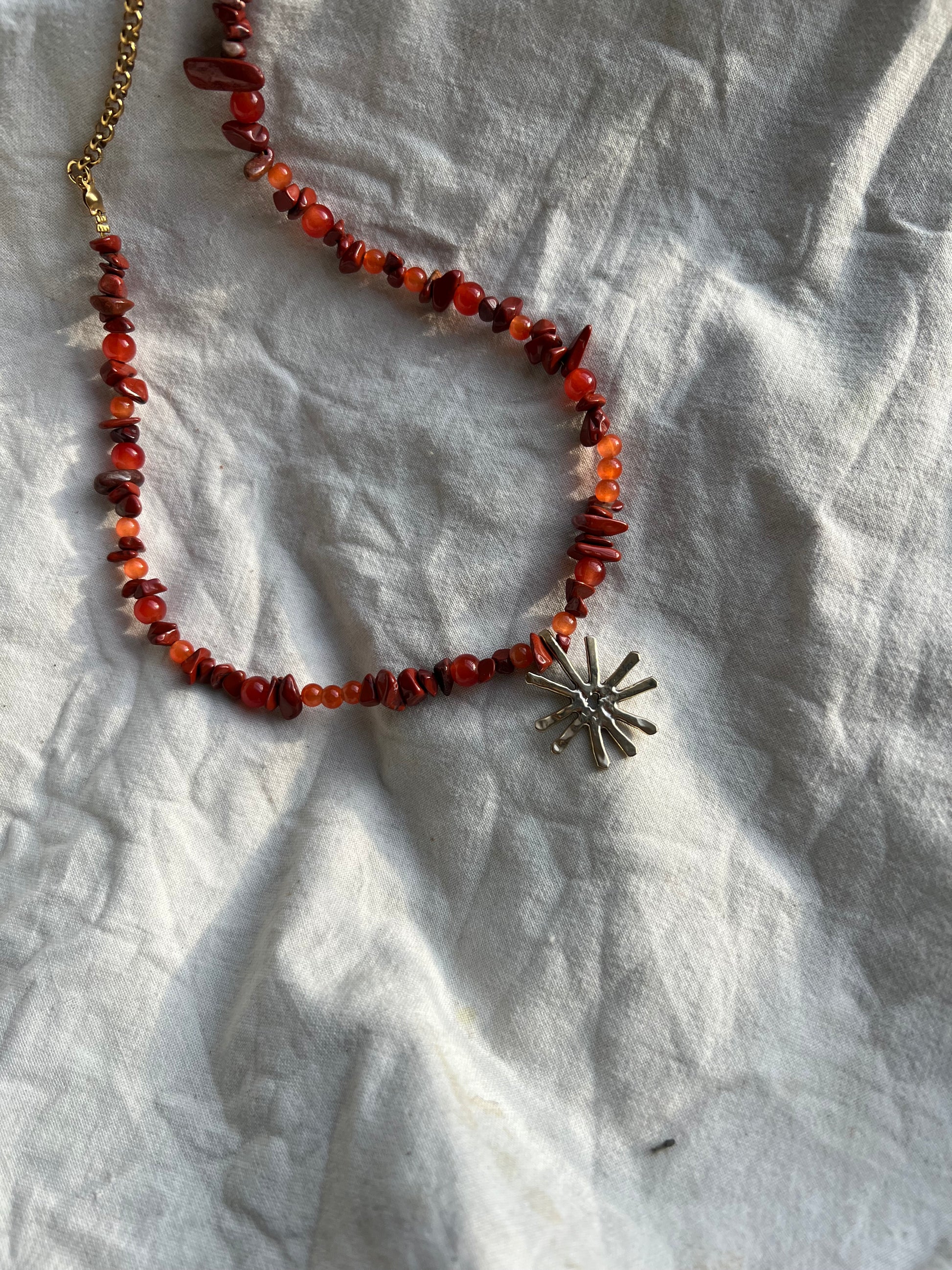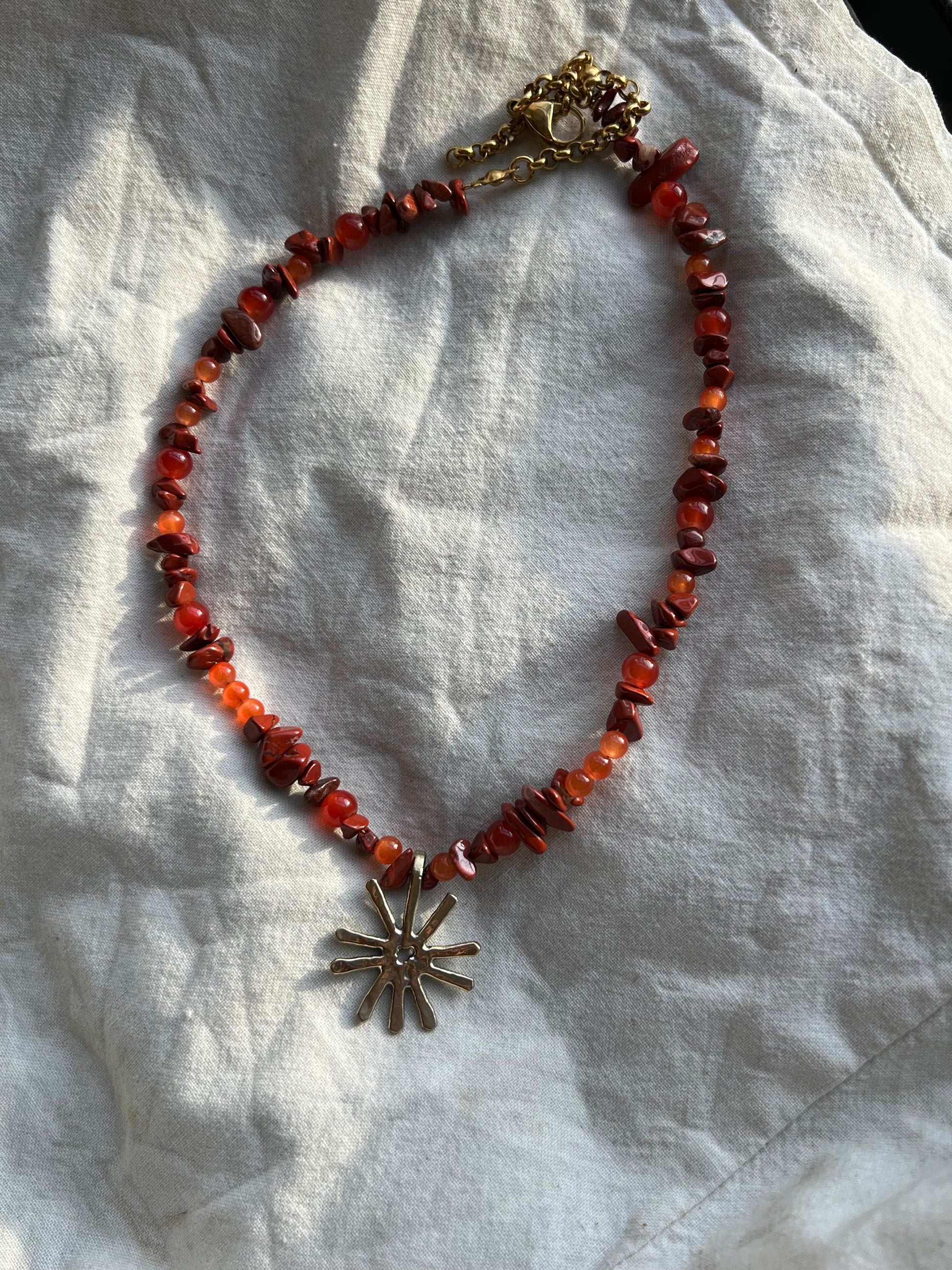 Sol hecho a mano de 2.5 cm de diámetro en bronce con piedras y perlas de vidrio a tono. también lo pueden pedir con el dije en alpaca y con otras combinaciones de piedras.